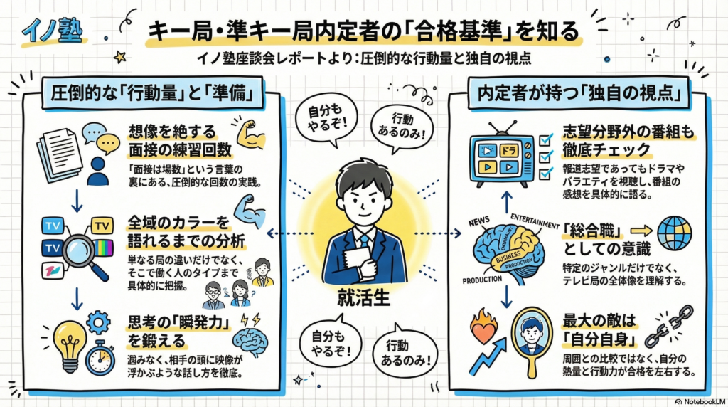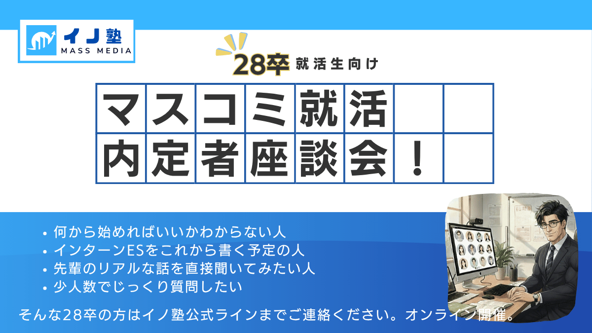 2025年4月3日(金)21時より、イノ塾主催、28卒限定「27卒キー局・準キー局内定者と座談会」を開催しました。 実際にキー局・準キー局の内定を勝ち取った先輩たちが、内…