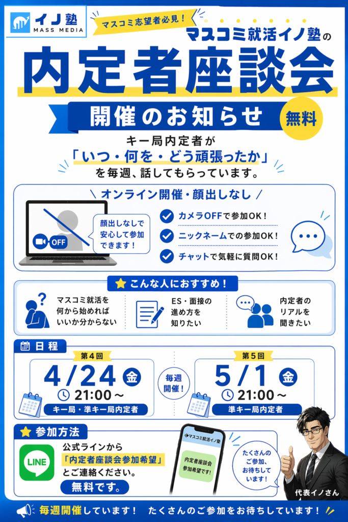 【第4・5回】マスコミ就活イノ塾|内定者座談会のご案内