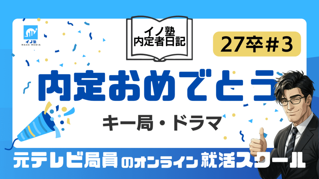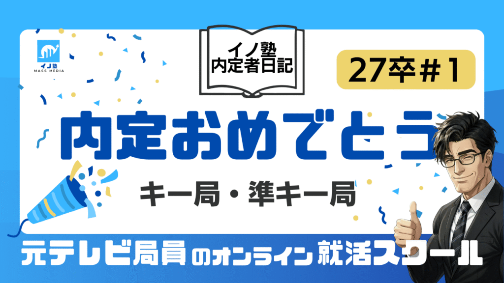 こんにちは!マスコミ就活転職イノ塾です。 27卒イノ塾生からテレビ局内定者が3名出ました! 実は、他にも27卒イノ塾生、テレビ局から内定をいただいています。 これで、27卒イノ塾生からキー局準キー局内定者7名に。 27卒キー局準キー局内定者 7名(2025... -