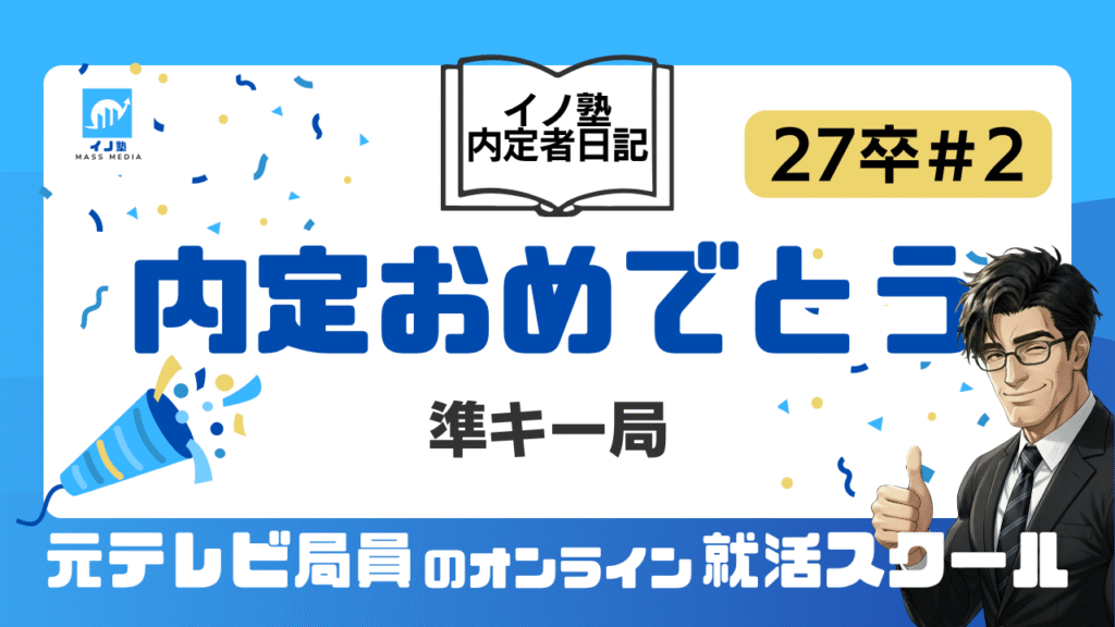 マスコミ就活・転職をオンラインでサポートしているイノ塾です。 ▶マスコミ就活イノ塾はこんなところです。 内定実績 27卒実績はこちら さて、今日はマスコミ企業の内定が決まった26卒27卒イノ塾生の「内定者インタビュー」をご紹介。 キー局、準キー局、... -